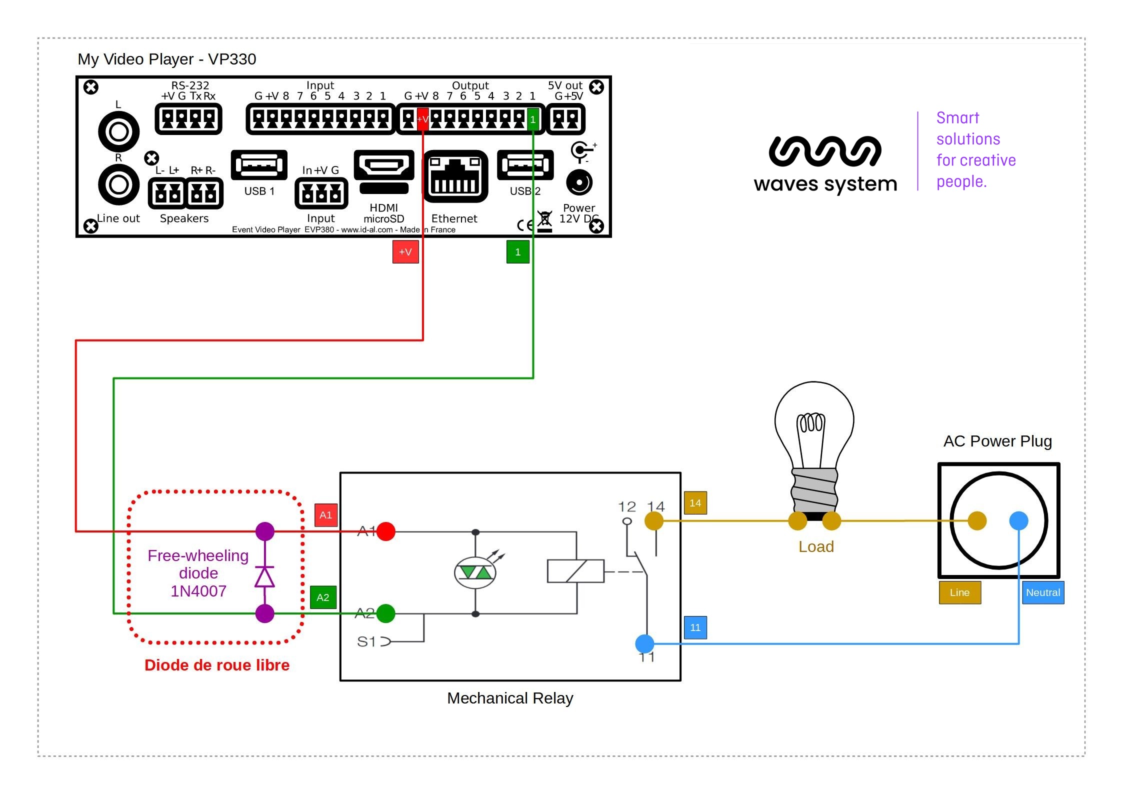 Les relais de sorties du lecteur sont de relais de contôle. Pour piloter un système éléectrique qui cosmme plus de 20V ou 500mA, il convient d'ajouter un relai de puissance. Voici le plan de cablage associé :