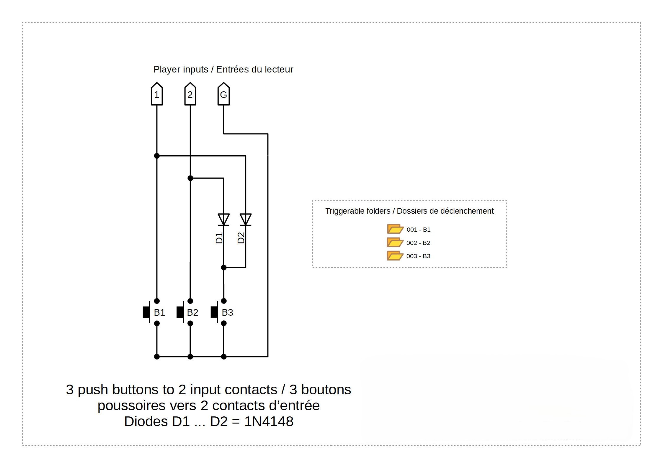 Connexion de 3 boutons poussoirs vers 2 contacts d'entrée avec des diodes