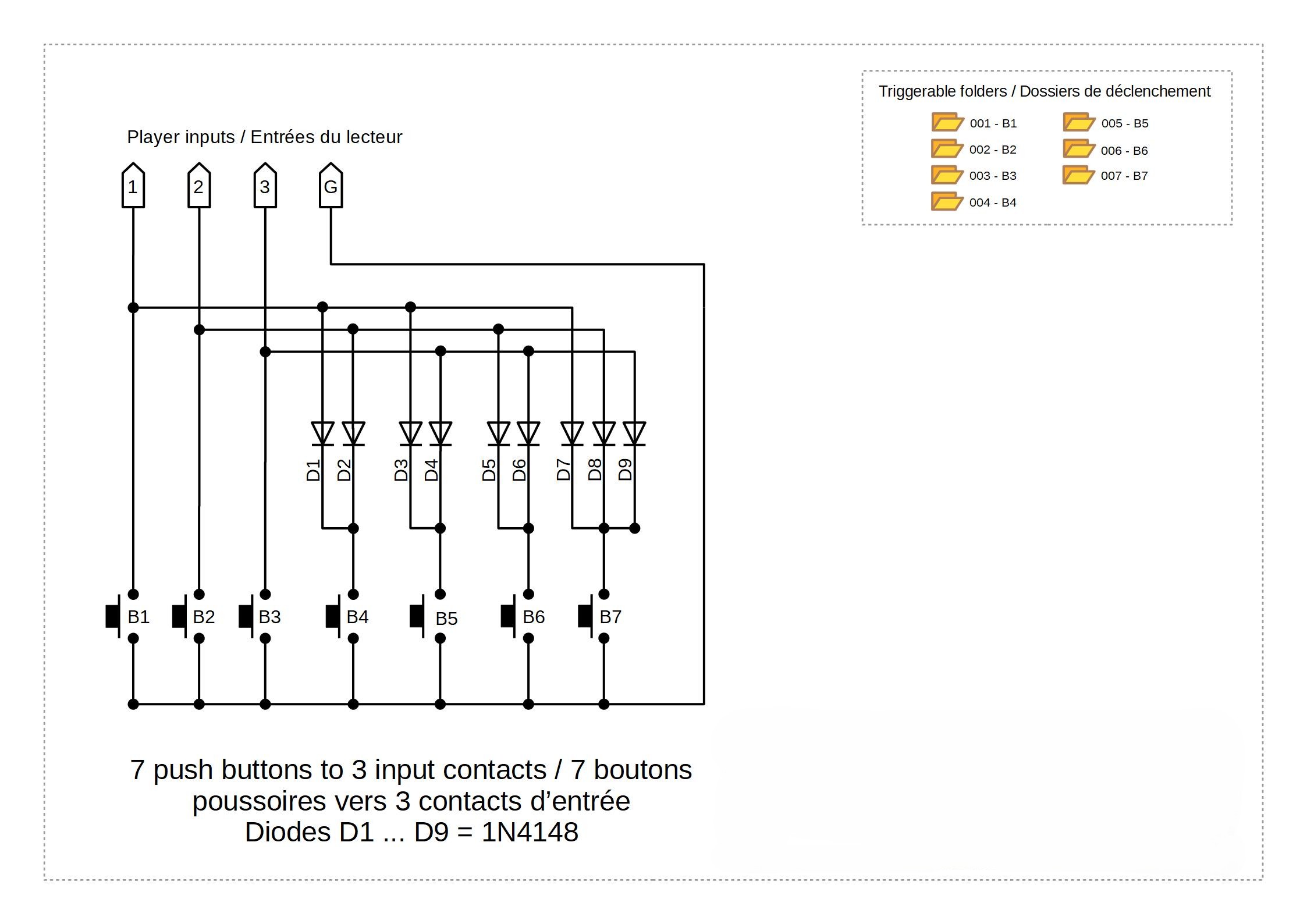- Connexion de 7 boutons poussoirs vers 3 contacts d'entrée avec des diodes