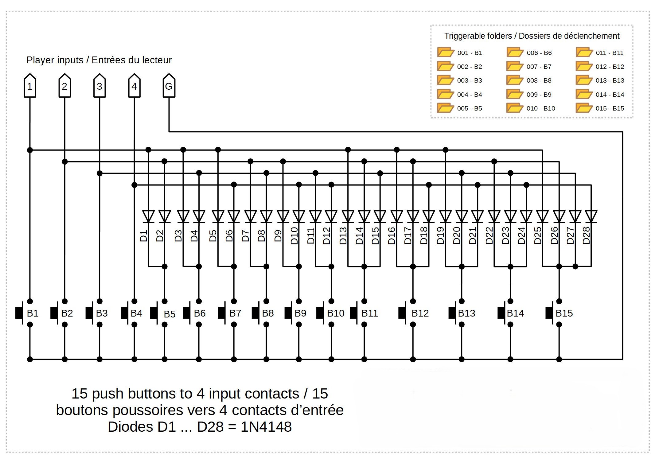 - Connexion de 15 boutons poussoirs vers 4 contacts d'entrée avec des diodes
