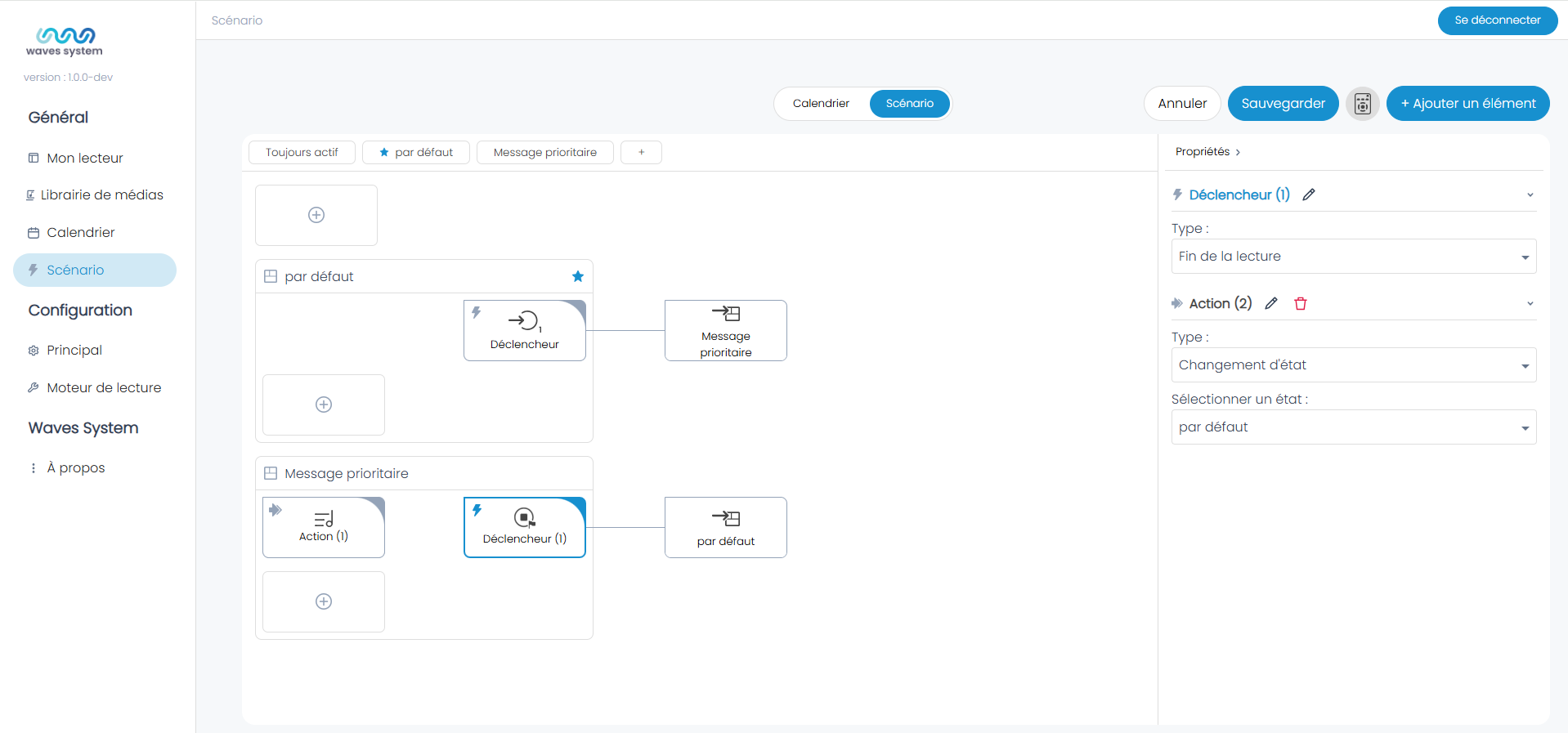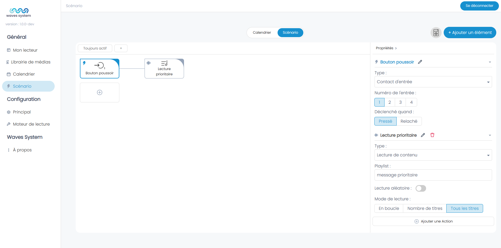 Le lecteur AP420 permet de construire des scénarios pour la diffusion de playlists et messages sur la réception d’événements. Son interface no-code permet de créer des scénarios simples ou complexes de diffusion.